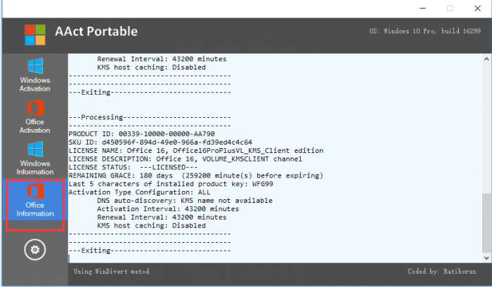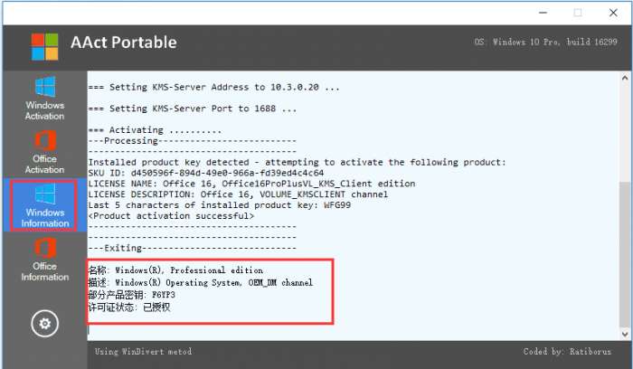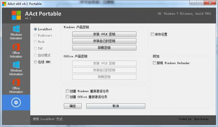 AAct Portable中文版是一款由俄国高手制作的用于激活的KMS程序,它能快速激活系统以及办公套件,该程序无需任何版本的 .NET Framework 支持,即可轻松激活,持手动安装及删除激活产品密钥、支持手动创建及删除续期计划任务。