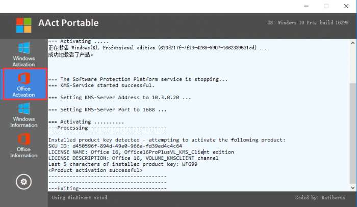 支持Windows、Office 零售版及批量授权版KMS激活;不需任何版本的 .NET Framework 框架支持,可以激活Windows Vista、Windows 7、Windows 8/8.1、Windows 10、Server 2008/2008 R2、2012/2012 R2、Office 2010/2013/2016 VL 版本。此外,您还可在 Windows XP 上激活 Office 2010 VL。