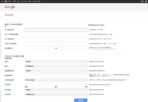 在谷歌高级搜索页面将上面的所有的高级语法集成,用户不需要记忆语法,只需要填写搜索词和选择相关选项就能完成复杂的语法搜索。