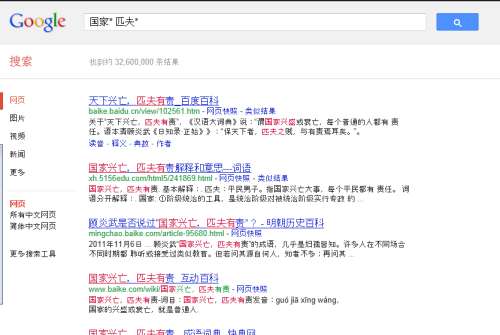 例如: 国家* 匹夫* google搜索会自动匹配出“国家兴亡,匹夫有责”结果。