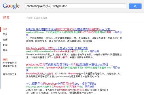 例如:photoshop实用技巧 filetype:doc
