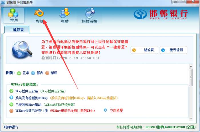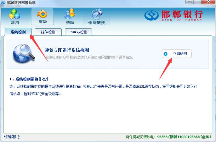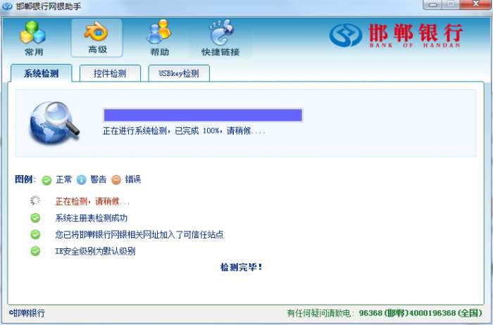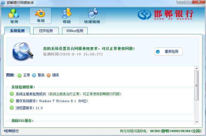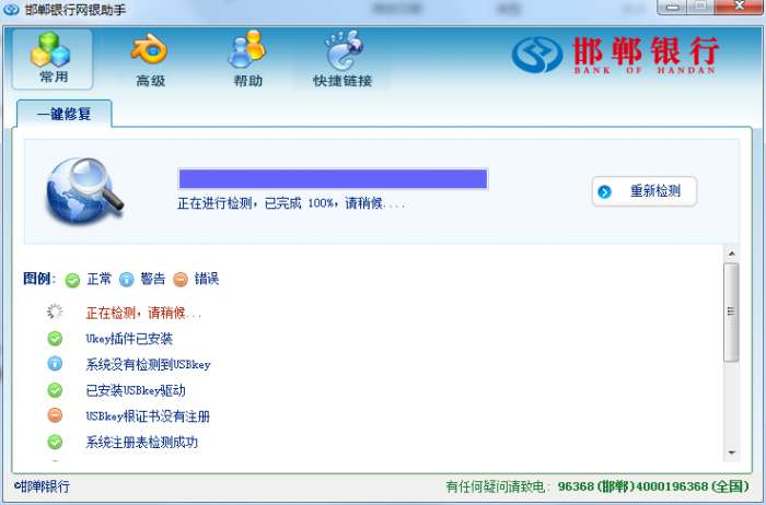 邯郸银行网银助手官方版能够方便用户快捷使用网银。邯郸银行网银助手帮助用户解决用户使用网银的环境配置,提供一键检测功能,帮助用户修复使用环境,解决必备组件的下载。