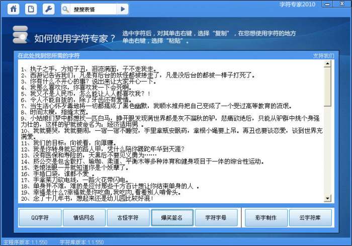 赛克字符专家2010是一款由赛克软件工作室自主开发的带有特色功能——“云字符库”功能的字符收集查阅软件,它收集当下最流行、最搞怪的字符,帮助人们快捷、方便的找到各种字符。通过赛克软件工作室的服务器,启用云字符库可以查获更多的来自世界各地的字符。