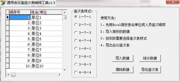 通用会议室座次表编排工具提供简单的编排方式,用户按照官方提供的Excel模板录入会议室数据以及参加会议的成员,随后将数据文件导入到软件,选择列表上八种座次表样式导出,从而立即制作会议室座次表,三个步骤就可以轻松制作座次表,适合需要安排会议的朋友使用,这款软件使用是非常简单的,打开软件就可以显示使用方法。