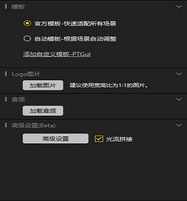 (2)、选择好文件后可以进行模板选择、是加入logo、音频、高级设置、光流拼接等。