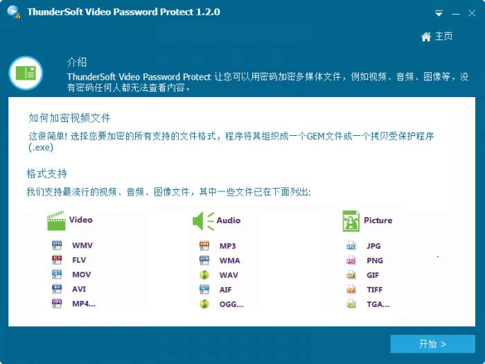ThunderSoft Video Password Protect 是一个视频加密软件,但是他不仅仅可以加密视频,还能够用来加密音频和图片,支持的格式非常多。使用此软件,您可以将视频、音频、图片加密成GEM文件或exe文件格式,这些文件受密码保护,没有密码任何播放器都无法播放。软件支持各种视频和音频格式,输出文件保持了原始的质量,并且可以直接播放而不用等待解压缩。使用拷贝保护技术,可以更安全地保护您的媒体文件。