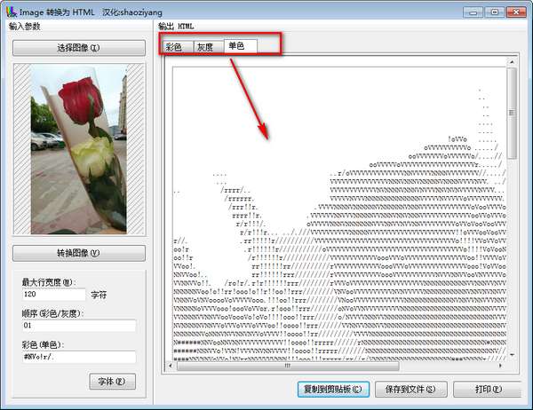 5、ImageHTML以三种颜色模式生成ASCII艺术:全彩色,灰度和单色。