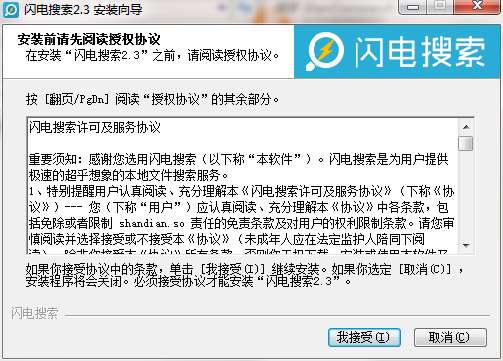 3.双击打开,进入闪电搜索软件界面,阅读安装许可协议,点击我同意,点击下一步