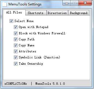 MenuTools提供的额外菜单项带有很多功能,并且在选中文件夹、选中文件、在桌面上显示右键菜单时会显示不同类型不同功能的菜单项。