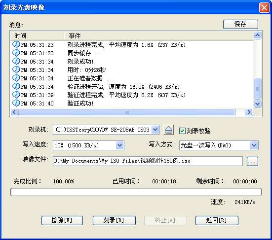 第五步,刻录。点击”刻录“按钮开始刻录光盘映像,‘刻录+刻录校验’可能需要花费几分钟到十几分钟左右的时间,请耐心等待刻录完成。刻录完毕之后,光驱会自动弹出。刻录成功。