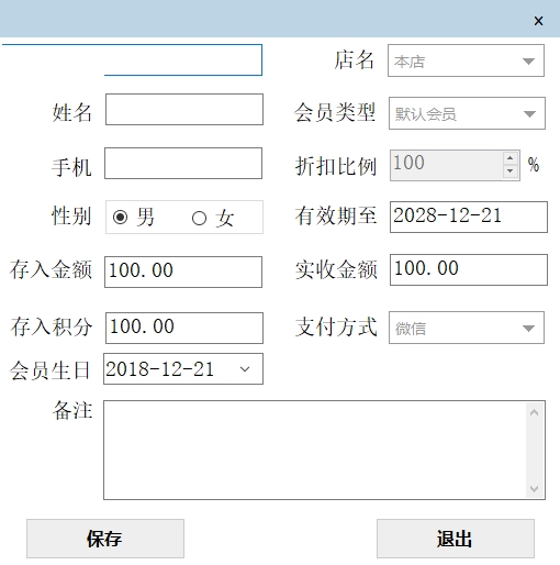 4、新增功能,在这里为新的客户添加会员,可以设置存入金额、存入积分、会员生日、备注