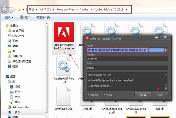 3、将数据包中解压出来的adobe.snr.patch.v2.0-painter.exe复制到上一步打开的目录下并运行,选中“Try to patch another product with the amtlib file (64-Bit)”然后点击右下角的patch即可