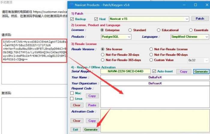 6、将软件中的申请码复制到注册机对应位置,然后点击generate生成激活码,它会自动填充到软件的激活码输入框中,没有填充的话自己手动复制粘贴一下。