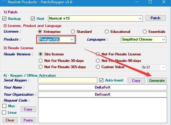 3、在注册机中,选择PostgreSQL,如图所示,点击generate生成按钮。