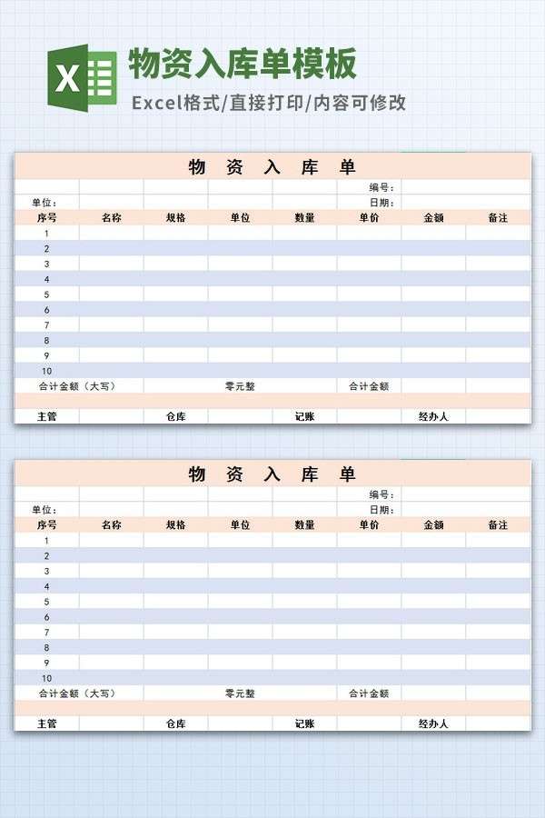 物资入库单模板是为用户打造的物资入库记录表格模板,物资入库单模板包含的信息有名称、规格、单位、数量、单价等,物资入库单模板由PK游戏网为您提供免费下载,源文件为Excel格式模板。