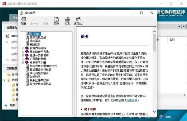 软件支持多达几十个命令,从最简单的鼠标键盘命令到复杂的对话框操作等等,这些指令的使用并不需要您有编程方面的基础, 所有命令的使用是简单且人性化的。通过这些命令的组合您可以设计出极其复杂的魔法,完成各种各样的操作。