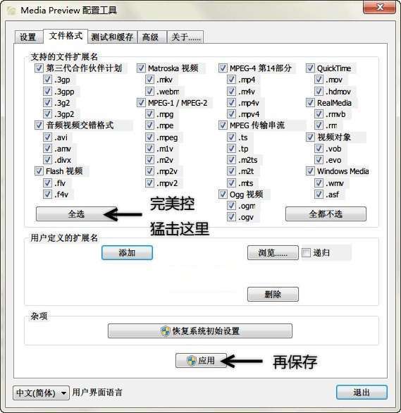 想轻松一点的朋友们可以直接在截图红线处快速选择你想要的预览图效果;不过,软件有很详细的中文提示说明,有专研精神的朋友还是可以自行调整参数。无论怎么样,设置完后点击应用即可。