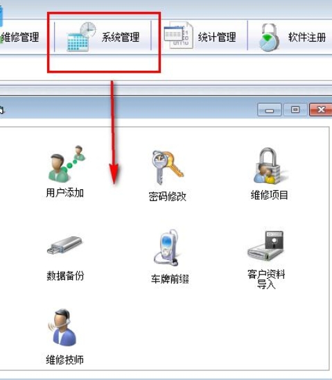 5、系统管理界面包括了用户添加、密码修改、维修项目、数据备份、车牌前缀、客户资料导入等;