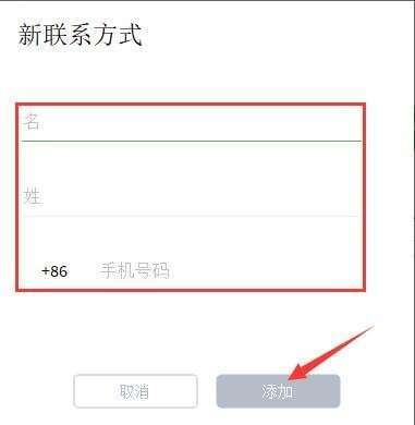 2、在弹出的新窗口中,依次输入好友的“名”、“姓”、“手机号码”,然后点击下方的“添加”按钮即可。