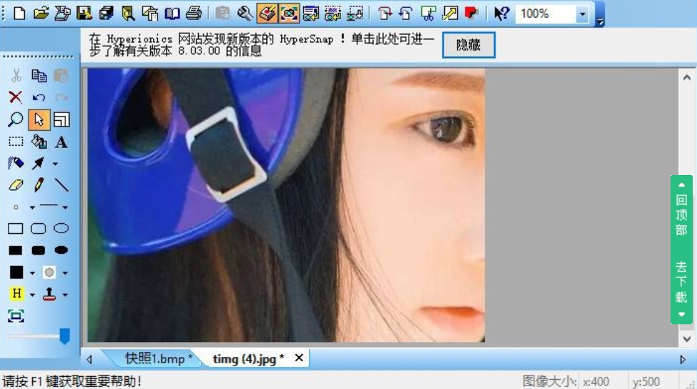 观察HyperSnap窗口底部的区域以获取有用的消息。 状态栏的右侧显示鼠标指针在图像上的基于坐标的位置,如果将鼠标指针移动到图像的窗口边框之外,它将更改为显示图像的整体大小。
