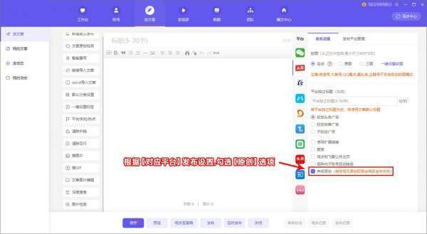 第一种:针对平台设置原创,通过【发布】页面对应【平台设置】区域,根据对应平台,找到设置原创选项【勾选】即可;