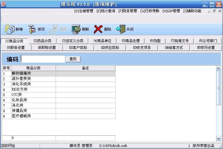 1.信息维护:用户登录、更改密码、选项设置、软件设置、门诊设置、品名维护、客户维护、会员维护、仓储维护、柜台维护、备份恢、系统日志;