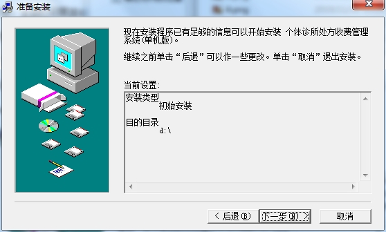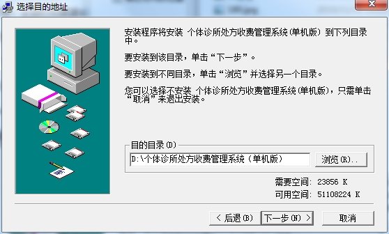3、选择目的目录,默认的是D:个体诊所处方收费管理系统(单机版),可以点浏览修改