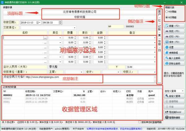 自由设置收据顶部标题1、顶部标题2、侧边备注、底部备注等;