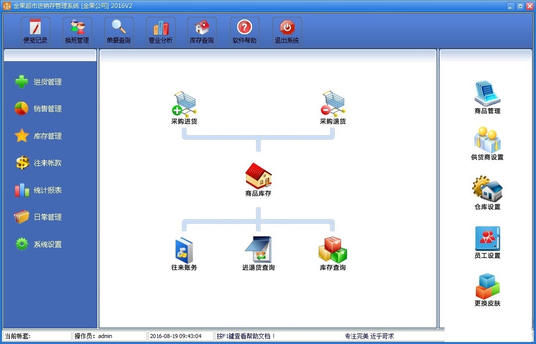 金果超市进销存管理软件官方版是一款管理超市的进销存软件,界面简洁美观、操作方便。该软件是集超市商品销售管理系统、超市库存管理系统、超市收银系统为一体的,可以帮助管理者非常方便地管理超市。