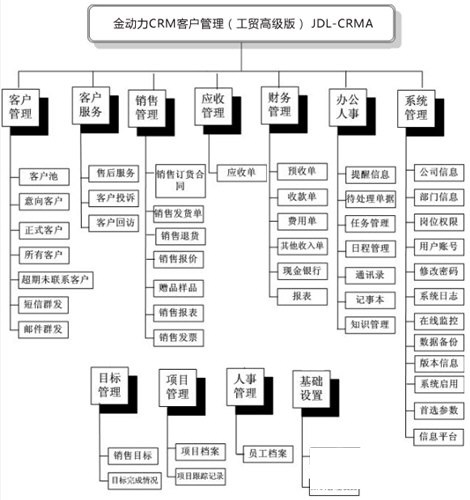客户管理功能模块:客户管理、客户服务、销售管理、财务管理、办公管理、其他功能