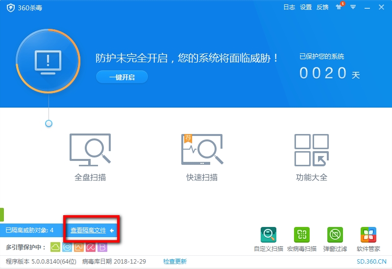 1、首先你需要打开360杀毒软件,然后在左下角的位置找到【查看隔离文件】点进去。