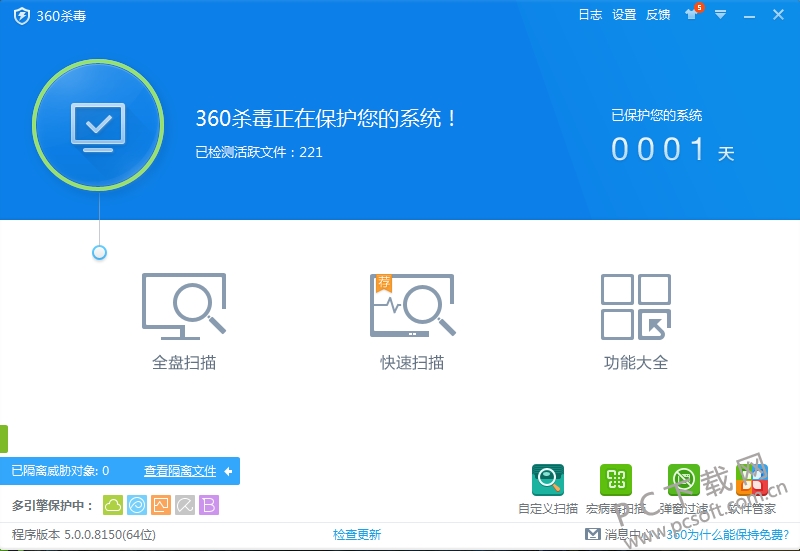 小编推荐:总是在访问网页或是下载软件后出现电脑卡顿或是其他被病毒入侵后的异常提示,那怎么解决呢?小编为你推荐这款360杀毒软件,下载安装360杀毒软件后一键进行检查当前电脑存在的病毒并对其杀毒删除。并且你只需要开启360杀毒软件后下载软件、访问网页时无需担心有病毒入侵,可自动帮你针对一切可疑文件进行查杀隔离。随时随地保护你的电脑安全。另外小编还为大家搜集整理了其他【杀毒】工具供大家选择下载,如:金山毒霸、QQ电脑管家等。