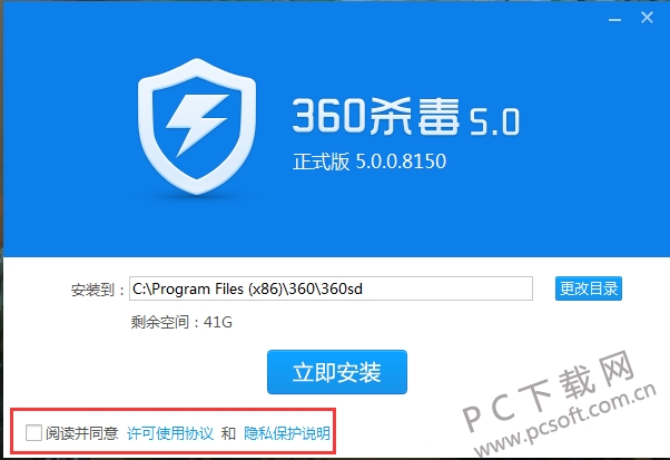 1、在本站下载360杀毒软件后,在电脑本地得到一个压缩包,使用360压缩软件解压后,双击.exe文件进入软件安装界面,需要您勾选【阅读并同意】,您可以点击【立即安装】,软件会默认安装,如果您要修改软件安装位置,您可以点击【更改目录】,在打开的窗口中,您可以自行选择软件安装位置。