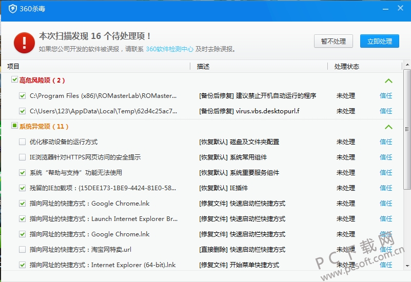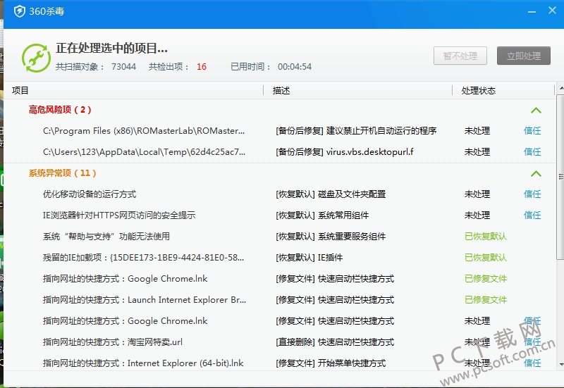 3、360杀毒软件扫描完成后,会显示您电脑存在的风险,点击【立即处理】