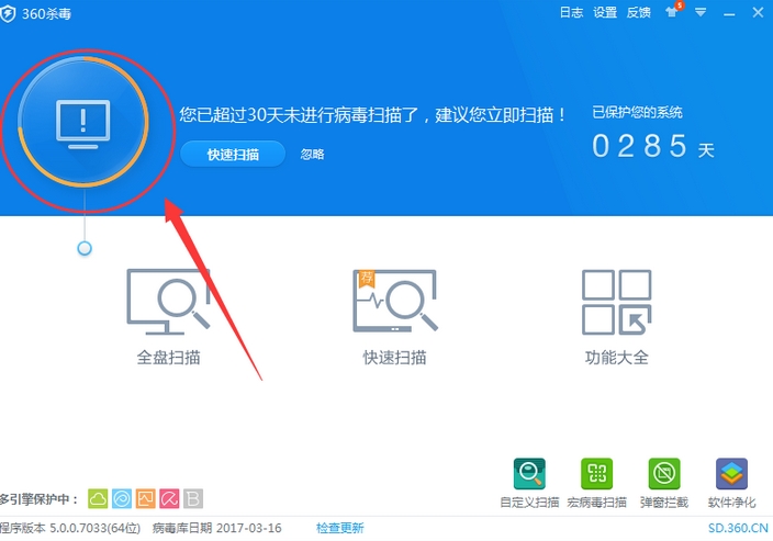 1、打开在本站下载的360杀毒软件,打开软件后,您可以点击【全盘扫描】,检测的电脑是否安全。