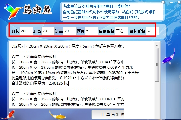 给出鱼缸数据快速计算材料多少和价格,误差小