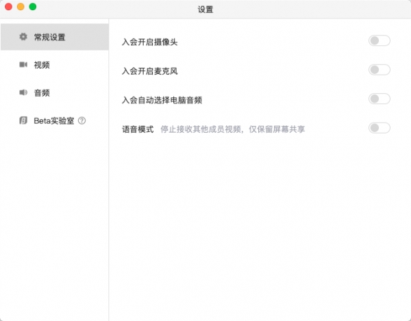 点击该按钮,即可唤出设置窗口,您可以在该窗口进行设备信息检测,查看您的摄像头、麦克风、扬声器是否被识别,同时可进入Beta实验室,体验最新黑科技