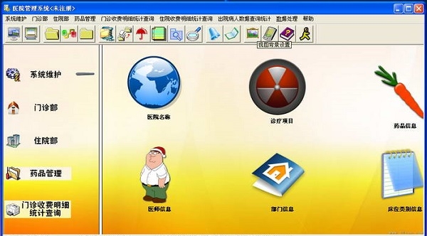 系统维护包括:门诊收费信息、经办人信息、医师信息、科室信息、住院费用信息、药品库、期间参数设置六项,此项是系统的基础数据,在使用系统前应先输入这些信息。