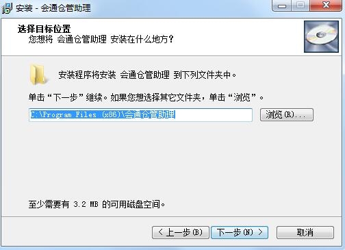 3、选择目标位置,默认的是C:program Files (x86)会通仓管助理,想选择其他文件夹点击浏览