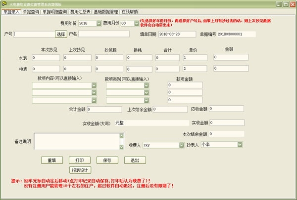 自动调出上月水、电表抄见度数,自动计算出用户水费,电费使用量和金额。