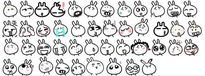 一只可爱的挤眉弄眼的小兔子,表情有急,迫,捂眼,惊,愁,怒,斜视,漂亮,切,上下动头,窘,色,不屑一顾,无奈,吃惊,眨眼,脸红,有手指骂人,微笑,苦笑,五观到一起,戴花,抖耳朵,猛眨眼,右看,困,叹,长胡子,抖左耳朵,呲牙,脸红蓝,啊,骂人,闭眼呲牙,吐舌头,灭,躲猫猫,笑得脸上有皱纹,。。。。