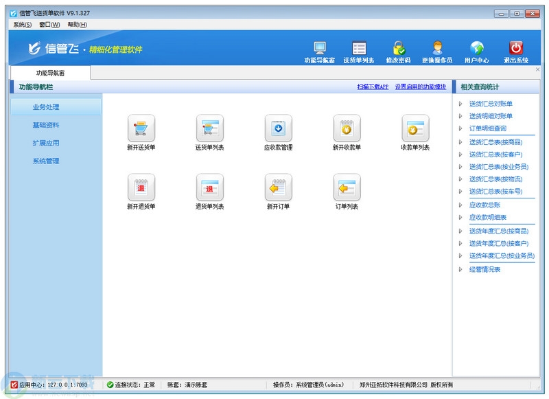 送货管理:送货单、退货单、送货汇总对账单、送货明细对账单、汇总表(按商品、按客户、按业务员、按物流和车号)、年度汇总表应收管理:应收款管理、应收款总账、应收款明细账;