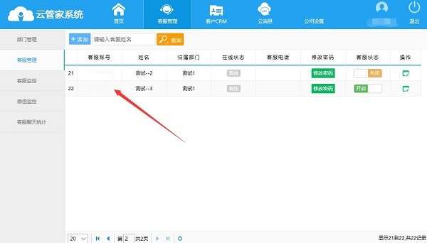 1、添加客服账号;点击“客服管理”在选择左侧的客服管理,点击添加,弹出新增客服的窗口,填写密码、确认密码等这些信息。云管家客服管理系统最新版填写完成后点击“保存”。客服账号添加成功。
