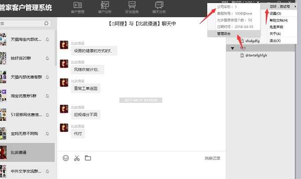 2、软件右上角有一个小三角,点击您好测试号,可以看到这个账号的信心,也可以打开管理后台,管理后台可以查看客户CRM管理,可以按照分组、标签等搜索客户,查看消息,也可以看具体的客户分析