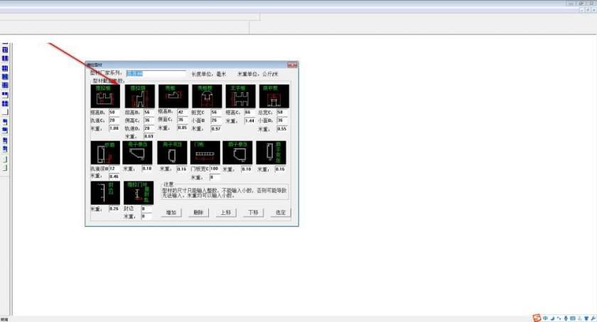 3、进入推拉型材的界面,可对型材厂家系列进行选择、长度单位的选择、米重单位等;
