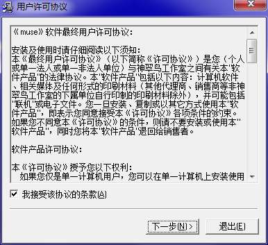 3.双击打开,进入Muse(曲谱软件)软件界面,阅读安装许可协议,点击我同意,点击下一步