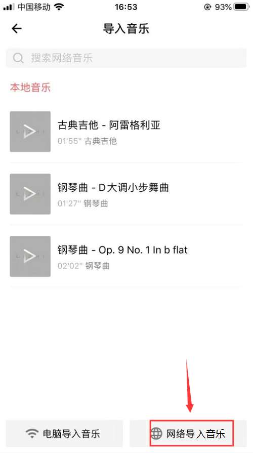 然后在音乐页面下方可以选择 电脑导入音乐或是网络导入音乐,如下图