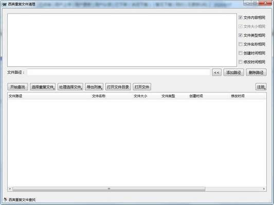 西宾重复文件清理官方版是一款简单易用的文件清理工具,西宾重复文件清理中文版用户可以通过它将电脑上多余的或重复的文件清理干净,支持一键清理,速度超快并且质量高,释放用户的内存,西宾重复文件清理官方版可以帮助用户清理内容相同、大小相同以及类型相同的文件。