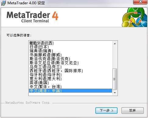 3.双击打开,进入MetaTrade软件界面,选择安装语言,点击下一步