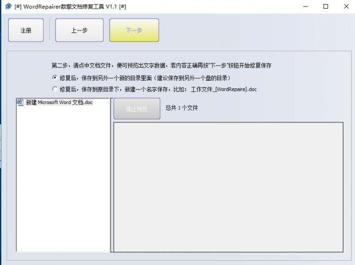 2、本软件支持单个文件的修复,或者修复一整个大的目录里面的所有文档文件以及子目录中的文档,修复后的文件按原来目录结构另存到别的目录下。